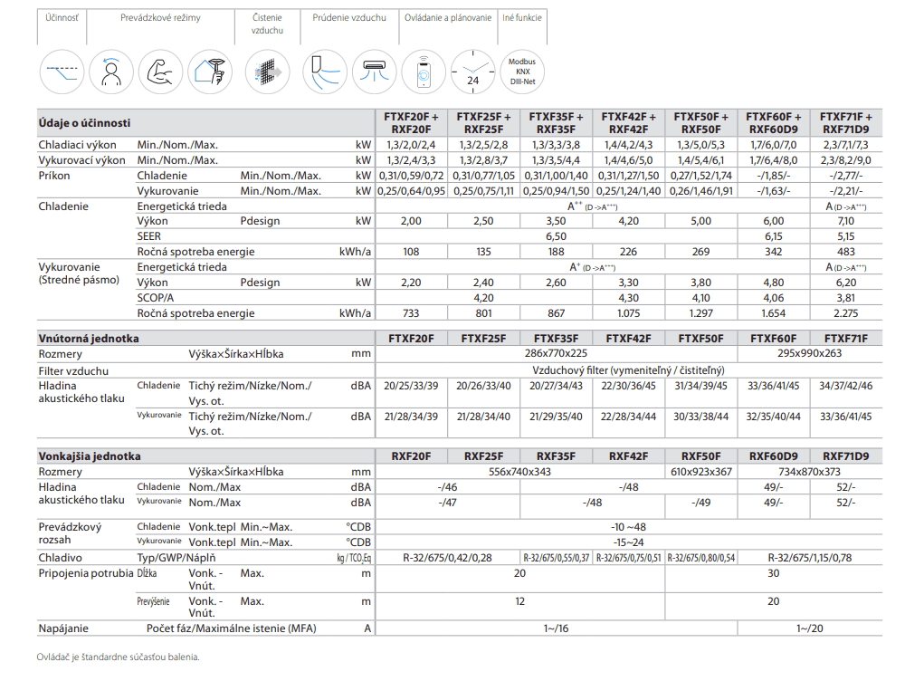 Pre ideálnu distribúciu vzduchu je možné nastaviť polohu klapiek horizontálne a vertikálne. Vertikálna poloha sa nastavuje pomocou ovládača. Horizontálna poloha sa nastavuje manuálne. Je možné nastavenie dvoch odlišných horizontálnych smerov fúkania zároveň. Medzi jej hlavné funkcie patrí chladenie, kúrenie a odvlhčovanie. Samozrejmosťou je infračervené diaľkové ovládanie a veľmi tichý režim prevádzky klimatizácie.
