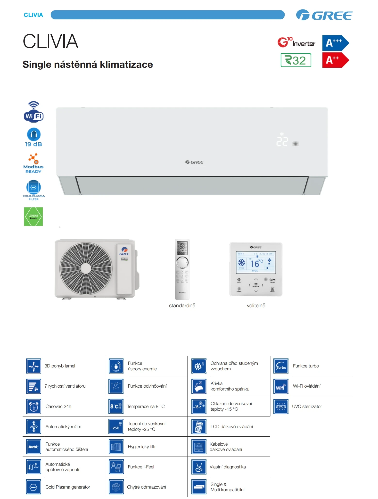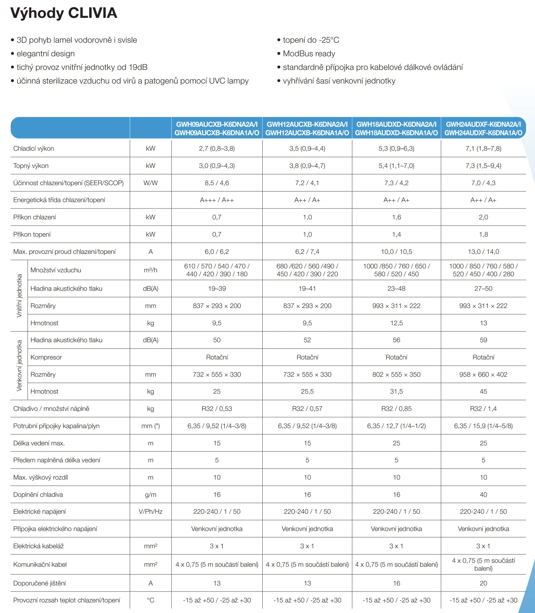 Elegantná klimatizácia s tichou prevádzkou od 19 dB, účinnou UVC sterilizáciou vzduchu a 3D pohybom lamiel. Spoľahlivo kúri až do –25 °C, ponúka podporu ModBus, vyhrievanie šasi vonkajšej jednotky a možnosť káblového ovládania.